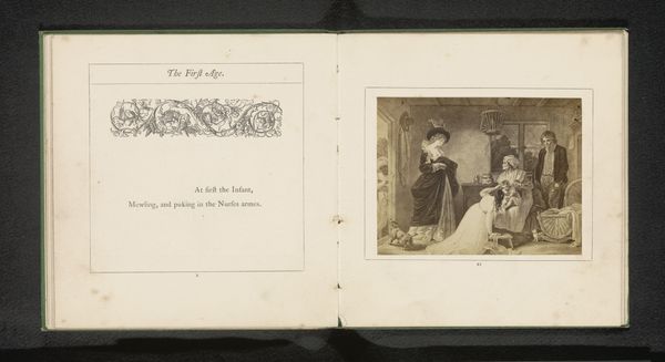 Curator: Let’s take a look at this photomechanical print from before 1864, titled “Fotoreproductie van een prent, voorstellende een oude man en een kind in een interieur." Editor: It’s undeniably intimate. The muted tones create this atmosphere of quiet contemplation. The figures, huddled together, suggest a sense of vulnerability. It really makes you pause. Curator: Indeed. Considering the era and the subject matter – an old man and a child – it is compelling to explore this through a social lens. Images of ageing, especially in relation to youth, often reflect anxieties about dependency and the cycle of life. How do class dynamics, perhaps implicitly represented here, shape those relationships? Editor: I think there’s an interesting narrative around dependency and intergenerational power. How does the child's presence either reinforce or challenge the old man's status and his understanding of his own position in the family and society? The scene feels a bit melancholic. Does this touch upon societal attitudes towards ageing? Curator: Absolutely. The socio-political constructs around ageing are highly gendered. We could ask whether the old man might embody a symbolic weakening of traditional patriarchal structures? Also, how is his dependency juxtaposed against the backdrop of 19th century conceptions of masculinity and agency? How might race and cultural norms also impact such an image's reception and understanding of this exchange? Editor: It also triggers a thought on domesticity in that era. Consider the composition - a family, possibly caught in a mundane daily scenario. Yet the artist chose to capture this specific interaction. Why? To perhaps valorize those fleeting instances of love and affection amid the structured norms. Curator: Very insightful. I also note the artistic reproduction method employed. How did this choice affect the accessibility and perception of such imagery to broader audiences? The original might have had a whole different reading had it been exhibited as an original drawing, instead of this readily distributed format. Editor: Right, the move from the hand-crafted to the machine-produced carries layers of political and cultural meaning about the definition and access to “art”. Looking at art through various disciplines really makes us see and question established assumptions and norms. Curator: Precisely. By examining its history, creation, and reception, we can uncover and reflect on both contemporary society and ourselves. Editor: Yes. Context, interpretation, discussion; all vital to an art experience.