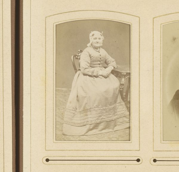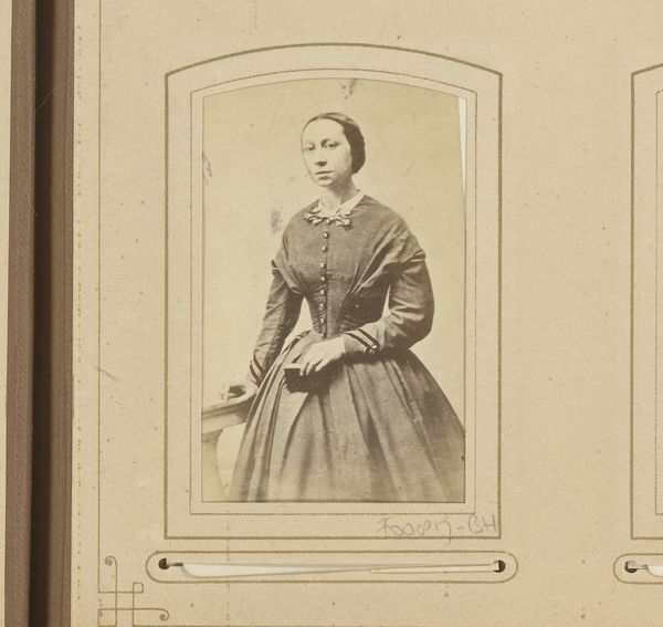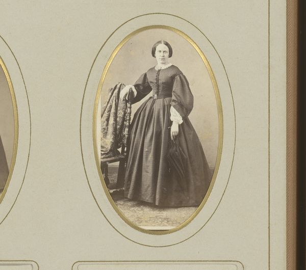 Curator: This photograph, titled “Portret van een staande vrouw, leunend op de leuning van een stoel,” dates from around 1866 to 1875 and it's by H.C. Donk en Co. What grabs your attention? Editor: I'm immediately struck by the materiality. The photographic print itself, and the woman’s dress, the way it's captured... you can almost feel the weight of the fabric. How would you approach it? Curator: For me, it's all about the processes at play. Think about the labor involved in creating both the dress and the photograph itself. The dress signifies the era's fashion industry, its intricate craftsmanship representing many hours of labor. Consider the photographic process: the collodion process to produce the negative, printing to albumen paper. What does it say about material production and social status? Editor: So you’re focusing on the production, and the societal implications... Do you mean how the rise of photography, enabled broader access to portraiture? It democratized representation compared to painted portraits? Curator: Precisely! This wasn't just about likeness, it was about participating in a specific social ritual. How does this "snapshot" affect the production of personal memory in that time? Editor: I see, the intersection of material, process, and social context is so important here. Before, I was only noticing the visual representation of the subject, and wasn't taking into consideration the wider aspects surrounding it! Curator: It really makes you think about the societal shift and how material production and labour shape that moment, right? A shift accessible even through the creation of a portrait like this one. Editor: Absolutely! Looking at this now, I wonder who the makers of her clothes and the components of the photograph were. Thank you, it’s fascinating to view the image from such a grounded perspective.
