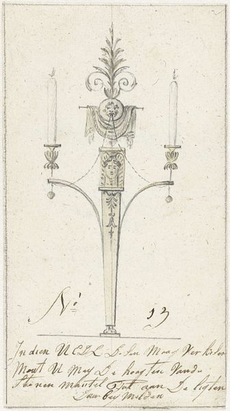 This is Abraham Meertens's "Ontwerp voor een kandelaar (No. 2)", a design for a candlestick created sometime between 1747 and 1823. Meertens lived during a time when the Dutch Republic was transitioning from its Golden Age to a period of political and economic challenges. Candlesticks like this weren't just functional, they reflected social status, taste, and access to resources. In a world lit by candlelight, the quality and design of a candlestick spoke volumes. The neo-classical urn shape with draped cloth and tassels suggest wealth and refined taste. The precise draftsmanship speaks to an understanding of design principles. Looking at this design, one wonders about the lives touched by the light it would have cast. What conversations, what secrets, what moments of quiet reflection did it illuminate? This drawing then is not just a design, but a witness to the intimate moments of the past.
