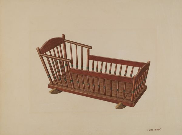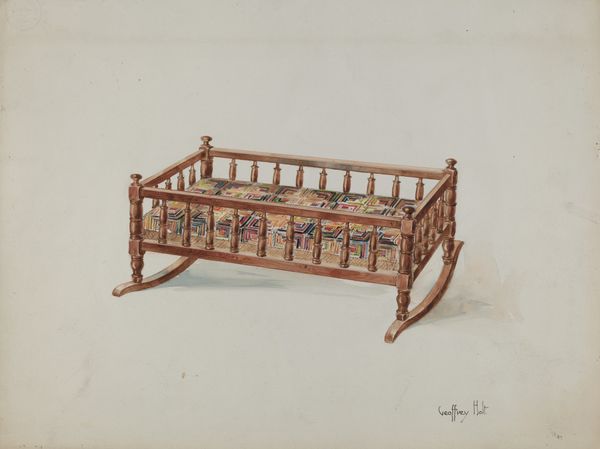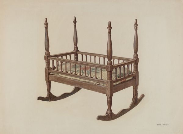 Curator: So, we’re looking at "Zoar Four-Post Bed", a watercolor and drawing made around 1937 by Fritz Boehmer. Editor: My first thought is...restful. There’s a gentle quality to the light and color. It almost makes me want to climb right in. Curator: It is quite inviting, isn't it? The drawing’s architectural, precise, but the watercolor adds softness. Beds like these were important in the Zoar community. The Zoarites were a German Separatist group that practiced communal living. These four-post beds were not merely furniture, but cultural artifacts, reflections of Zoar’s commitment to simple living. Editor: I see. So, what does choosing to portray a bed say about values? A place of rest, dreams, but also, perhaps, intimacy denied? Curator: Exactly. It touches on those community beliefs. These beds would have been uniformly made, adhering to the group’s principles of equality. No one Zoarite had a more luxurious or comfortable bed than another. Boehmer’s choice to isolate this object, stripped of a domestic interior, also throws it into stark relief as an emblem of their societal ideals. Editor: Interesting that the artist is so attentive to the materiality of the bed while presenting it as an idea, an emblem of a community. Curator: I’d say that tension is part of the drawing’s power, even now. We're looking at something quite ordinary, rendered with careful strokes. Editor: It makes one reflect on the politics of domestic life in the 1930s as well. You know, it occurs to me how revolutionary the choice to focus on communal, rather than individual, life was and still is. Even down to the details of bedposts. Curator: Well, the clarity and calm precision, paradoxically makes me restless. Editor: See? Sleep isn't always sleep. Thank you.