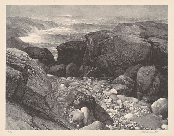 Editor: This is "Land's End, Cornwall," an engraving by Clarkson Stanfield. The jagged rocks jutting out into the sea feel so imposing. What story do you think this landscape is trying to tell? Curator: I see the romanticization of nature mirroring England’s colonial ambitions. The stoic lighthouse and distant ship underscore a narrative of dominance, yet the untamed rocks hint at nature's resistance. How does this tension inform our understanding of national identity? Editor: That's a perspective I hadn't considered. It makes me think about who is included and excluded from this idea of national identity. Curator: Exactly. By examining the cultural context, we can uncover whose stories are prioritized, and whose are silenced, within these seemingly straightforward landscape depictions. Editor: I'll definitely keep that in mind moving forward. Curator: It provides crucial awareness for thinking about art in the present.