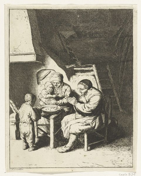 Curator: Standing before us is a Dutch Golden Age drawing by Nicolaes van Haeften entitled, "Man met een pijp en een kruik," which translates to "Man with a pipe and a jug," dating approximately from 1673 to 1715. It is a work rendered in charcoal. Editor: It gives such an immediate feeling of quiet melancholy. The charcoal imbues it with a smokiness, as though we're glimpsing a moment both intimate and universally burdened. The subtle gradations are striking. Curator: Van Haeften's meticulous attention to the folds and texture of the clothing draws our eye, a focus that elevates what would otherwise be a common genre scene into a testament of human labour. Notice how the texture created in charcoal gives us clues of textile production and commerce of the Golden age. Editor: I find it fascinating how this piece fits into larger socio-political structures. During the Dutch Golden Age, the taverns were more than places of recreation; they were contested spaces, central for social mobility among laborers but viewed by elite classes as sources of vice. Curator: Precisely. The details in rendering, the simple jug, and the plain garments—they remind us that the subject may likely be ordinary labourers, highlighting the material conditions that shaped everyday life and artistic representation during the Dutch Golden Age. Editor: To your point, how striking is the central figure’s direct gaze, and how much meaning is encoded by gendered dynamics and social class! Is it inviting, or defensive? A response, perhaps, to centuries of power imbalances. Curator: Indeed, Van Haeften captures a delicate balance of accessibility and isolation within this rendering. Consider how widely available and portable charcoal was at this time. These realities deeply affected art creation and availability to the general public. Editor: This charcoal portrait speaks volumes. It encapsulates individual experience against broader struggles and systems—reminding us how integral intersectional identity is when regarding both art and society. Curator: Analyzing van Haeften's work is a testament to how looking into methods and substance connects history with social reflections and art. Editor: "Man met een pijp en een kruik" encourages viewers not only to interpret the scene before us but also reflect upon identity, labor, and societal dynamics through an inclusive perspective.
