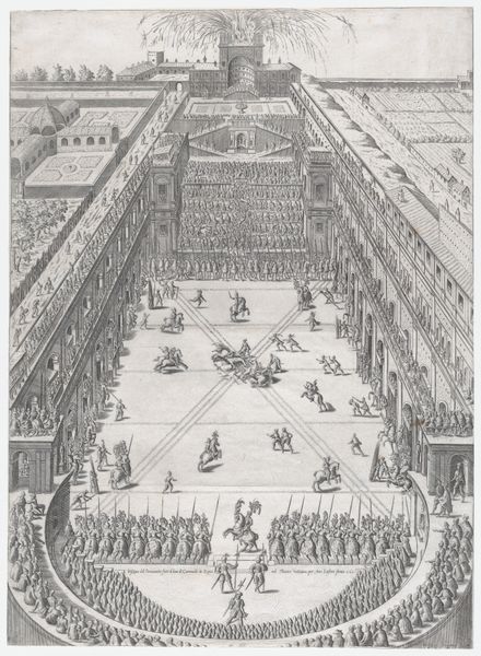 Stefano della Bella created this print, *Theater at Modena*, sometime in the mid-17th century, capturing the spectacle of courtly entertainment. At this time, theater was inseparable from the display of power and wealth. Consider the scene: spectators fill the stands, their presence as crucial to the event as the performance itself. But who are these spectators? Likely, they represent a narrow segment of society: the nobility and wealthy merchant class. Their privileged position underscores the rigid social hierarchies of the time, where access to culture and entertainment was a marker of status. The triumphal car and the horses in formation—elements of the performance—serve as symbols of power and order. It’s a world carefully constructed to reinforce existing social structures. What happens to those left outside of the frame? Della Bella's print invites us to consider the theater, and its audience, as a stage for social and political performance. The print is a window into a world where identity was not just personal, but a product of social standing.