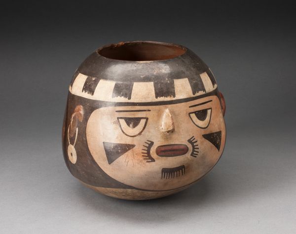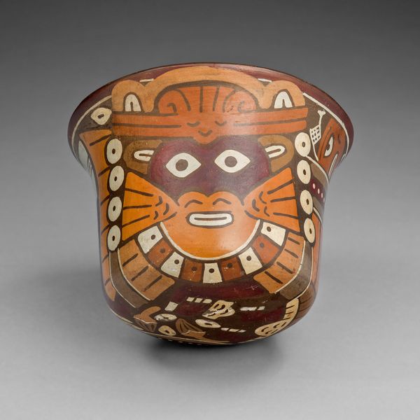 This painted pottery cup, depicting a masked performer, was created by the Nazca people. The cup presents a striking image dominated by geometric forms and stylized figures. Notice how the artist uses a limited palette of red, white, and brown to create a powerful visual impact. The composition is structured around a central masked figure, likely a performer or ritual leader. The mask is rendered with bold outlines and symmetrical patterns, which may symbolize the performer's transformation or connection to a supernatural realm. The careful arrangement of shapes and lines creates a sense of balance and order. The cup’s decoration, far from being merely decorative, participates in a larger cultural discourse. The structure of the mask itself, with its abstract and symbolic elements, may hint at deeper cosmological or religious beliefs.