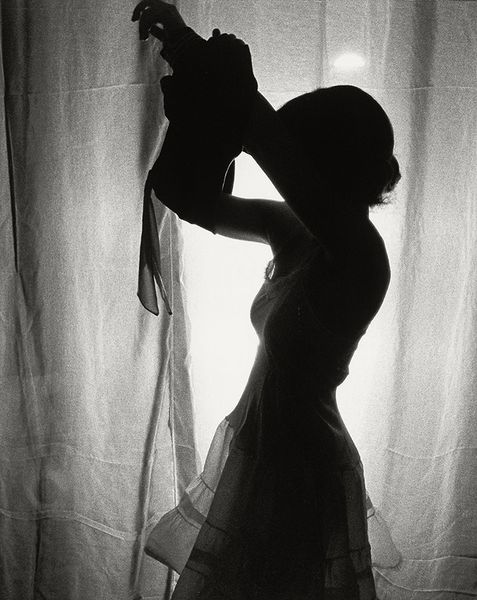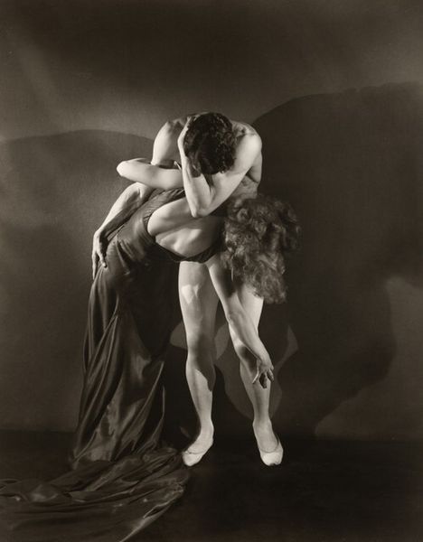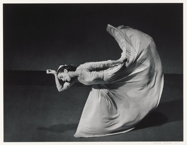 Barbara Morgan captured this gelatin silver print, "Puritan Love Duet" with Erick Hawkins from Martha Graham's "American Document." The photograph reveals a study in contrasts: light and shadow, movement and stillness, male and female. Graham arches back, her face and outstretched arm illuminated, conveying both vulnerability and defiance. Hawkins, a dark, looming form, seems to restrain her, creating a visual tension that speaks to the push and pull of their duet. Morgan’s choice of black and white enhances the starkness and intensity of the scene. The composition, with its dramatic lighting, emphasizes the struggle and constraint inherent in the "Puritan Love Duet". It challenges conventional notions of love and partnership by revealing a complex interplay of power and emotion. The photograph becomes a stage, capturing a moment of profound cultural and philosophical discourse.