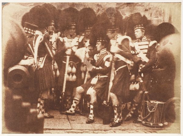 Curator: This daguerreotype, “The 42nd Gordon Highlanders, Edinburgh Castle,” was taken between 1843 and 1847 by Hill and Adamson. It feels almost…staged. There's a stillness despite the subject being soldiers and weaponry. What stands out to you? Editor: The cannons! They look enormous and imposing. But I’m struck by the fact that these men in their tartans and feathery hats are placed next to such destructive objects. The contrast feels deliberate. How should we interpret the placement of materials within this photograph? Curator: Precisely! Consider the means of production, not just of the photograph, but also of the Highland regiment itself. What resources - both human and material - are required to manufacture the soldiers’ uniforms, their weapons, their identity? This photo monumentalizes British power at this specific point in time. What does this reveal about the social context of Romanticism as a style, juxtaposed with industrial innovations such as photography? Editor: I see what you mean. The "romantic" part is, on one level, all of this imagery, their clothing and accoutrements - the guns and kilts are being carefully rendered to elicit feeling. Curator: Yes, and by using the then-new technology of photography to capture this scene, the work implicates these romantic ideas within Britain's emerging status as an industrial empire. We must examine how the photographic process itself – the labor, the materials, the distribution – reinforced existing power structures. Who had access to this technology, and whose stories were being told? Editor: So, the photo itself isn't just a neutral record. Its production is entwined with economic and cultural forces at play in that time? Curator: Exactly. It forces us to confront the material conditions that underpinned both artistic representation and the very identity of these soldiers. Think about it as both a beautiful artifact, and also as an advertisement for military, and British, might. Editor: This has given me so much to think about. I will look at images with new eyes. Curator: Likewise, considering how even "art" has roots in production of all kind reveals deeper insight and cultural messaging that speaks of power.