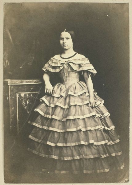 This photograph, "Les rubans découpés" by Pierre-Louis Pierson, captures a poised woman in elaborate attire. The sepia tones and the composition draw us into a world of 19th-century elegance. Pierson employs a formal arrangement, positioning the subject centrally, her gaze meeting ours, which invites a direct engagement. The dress is a study in contrasts: structured bodice, a full skirt adorned with meticulously cut ribbons. These elements create layers of texture, playing with light and shadow. The ribbons, precisely shaped, add depth, giving the image a sculptural quality. Pierson's work challenges conventional portraiture, using costume and setting to explore themes of identity and representation. The photograph’s composition and detail are not merely decorative but form a complex visual language. The photograph invites us to consider how meaning is constructed through artifice and how the surface of an image can reveal deeper cultural narratives. It's a testament to photography's power to not just reflect reality but to interpret and transform it.