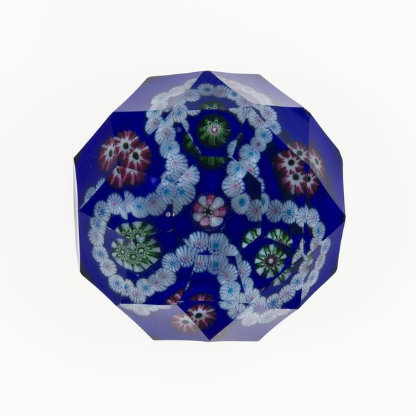 Editor: So this is a glass paperweight made by the Compagnie de Saint Louis around 1845-1855. The floral pattern trapped inside is mesmerizing. What do you see when you look at it? Curator: It's more than just a pretty object. Consider its historical context: mid-19th century. What societal values were being "contained" or, perhaps, carefully displayed, like this intricate design? We can also consider how decorative arts were regarded – often deemed 'feminine' or less serious than other art forms. How does this influence our interpretation? Editor: That's interesting! I hadn’t considered gender implications. It looks like perfect symmetry, which might imply a rigid structure. But maybe that perfectness is an illusion? Curator: Precisely. This paperweight uses control of the artistic process, a carefully constructed artifice, if you will, to create an illusion of perfection. But what about the labor involved in its creation? Whose hands were creating these objects? And were they considered artists or mere craftspeople? Editor: So it’s both an object of beauty, and a reflection of the socio-economic structures that enabled its production? Is the purpose of the paperweight merely utilitarian, or are there layers of commentary trapped within? Curator: It’s both! Objects like these participate in a cultural dialogue about labor, value, gender, and aesthetics. By engaging with those questions, we activate the object, acknowledging its place within the art-historical canon and within its own time. Editor: This gives me so much to consider beyond its simple aesthetic appeal! Thanks! Curator: It’s a testament to the power of viewing art through the lens of history, class and gender, even in the case of seemingly simple art objects.