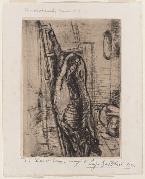 Curator: Looking at this image, one is immediately struck by its unsettling quality. The heavy blacks and stark whites create an atmosphere of palpable unease. Editor: Today we’re exploring "Der Brandhauptmann," an engraving by Imre Reiner created in 1940. This print is a powerful example of figuration within an expressionist style. Curator: The printmaking process itself seems crucial here. Reiner’s meticulous engraving allows for an extreme tonal range, the deep furrows holding the ink, the textures emphasizing the sitter's burden. It evokes the idea of resilience under pressure. One has to think about the economic climate in which this artwork was created to fully appreciate it. Editor: Indeed. The portrait is arresting, not just because of its technical execution, but also due to its unusual composition. The head, helmeted and burdened with intricate details, dominates, whereas this almost spectral second head stands to the side, constructed from stark, linear forms. It feels somewhat like a deconstructed rendering of another face, and its placement in the background is uncanny. The texture feels crucial. Curator: Texture becomes form here, truly. The very material choices – the physical act of engraving, and the type of paper used for the print – reinforce the meaning, making it more than just representation, but an act of physical engagement with sociopolitical concerns of the period. How the prints were distributed, by whom they were bought, that's a conversation too! Editor: And those high-contrast areas work as intended in the artist's process—it contributes significantly to the figure's overwhelming presence. A fascinating print overall. Curator: I agree. This really underlines the deep links between the art object and its role in cultural history. Editor: Exactly. Analyzing this expressionistic print via its forms certainly helps unlock its symbolic power and invites deeper appreciation of the work.
