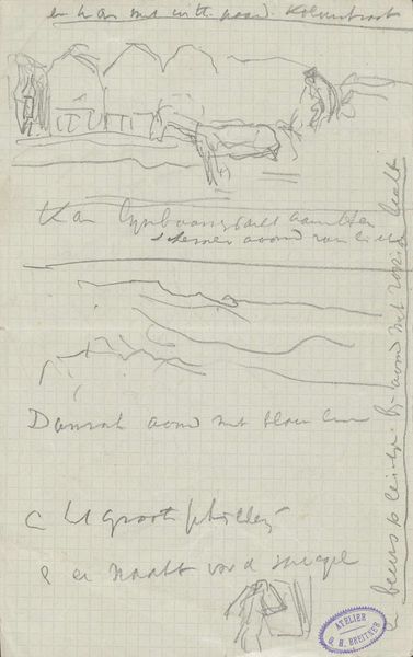 Curator: Look at this piece by Gerrit Willem Dijsselhof, dating sometime between 1876 and 1924. It’s called "Landschap aan de voet van een heuvel, met kleurnotities"—Landscape at the Foot of a Hill, with Color Notes. You can find it here at the Rijksmuseum. Editor: It has the intimate feel of a personal sketchbook. All the layered pencil strokes, and little color notes, it gives us insight to the process. Curator: Absolutely, and I think that the annotations are especially illuminating in their exploration of color relationships within this humble scene. Dijsselhof’s impressionistic style, even in sketch form, points to a broader interest in capturing subjective experience. How can we use such works, often relegated to sketchbooks, to reimagine our understanding of landscape art and its socio-political implications, moving away from romanticized visions towards the tangible realities represented? Editor: Well, examining the material Dijsselhof used, like pencil and paper, it reveals how easily landscapes could be made accessible through cheap materials; therefore democratizing image creation by focusing on landscape, traditionally considered to be 'high art', it actually could be argued to provide insights on environmental issues of the time. Curator: It challenges assumptions that these rough sketches do not contribute substantially to the wider development of art historical movements; considering his attention to subtle changes in light and color; that suggests that, for Dijsselhof, color became as much a tool for documenting reality as it was for imbuing it with emotion. This seemingly casual piece provides entry points for investigating themes of identity, observation, and our perception of landscape. Editor: For sure! It helps me think about art making less as something rarefied, more something practical, labor oriented even, especially when you look at what constitutes ‘fine art’ within museums. It also lets viewers recognize themselves as capable of creating work and challenging existing social heirachies regarding artwork and production. Curator: Indeed. It's the unrefined nature of this "Landschap aan de voet van een heuvel" that becomes the most compelling quality. Editor: Definitely seeing beauty in the means.