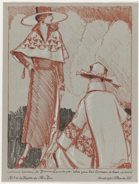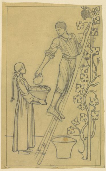 This evocative drawing of two women in late 18th-century dress was made with pen and ink, and watercolor wash, on paper. It appears to be a study for a larger painting, perhaps left unfinished. The artist, William Edward Frost, has used diluted blue ink to create a sense of volume and depth, playing with the transparency of the material to suggest the folds and drapes of the women's garments. The way the wash is applied is quite gestural, more about quickly capturing the scene rather than slowly building up a detailed depiction. The artist's hand is evident in the way he has laid down the pigment, allowing it to pool and dry unevenly, creating a textured surface. It's fascinating how the materiality of ink and paper, usually considered humble materials, can be used to such expressive effect. Ultimately, this work blurs the lines between sketch and finished piece, revealing the artist's process and emphasizing the inherent beauty of simple materials.