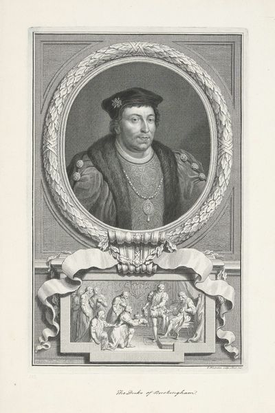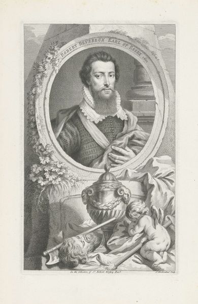 Jacob Houbraken created this portrait of Thomas Howard using engraving, a printmaking technique where lines are incised into a metal plate, which then holds ink and transfers the design to paper. Consider the labor involved: the careful planning, the precise cutting of lines, and the physical demands of working with metal. The material itself dictates the image. The stark contrast between the dark ink and the white paper creates a graphic quality, emphasizing line and form over color and texture. The engraved lines create a network of shading, defining Howard's features and clothing. The image gains social significance as the engraving process allowed for mass production and distribution of images. Houbraken's print engages with histories of craft and fine arts. He elevated printmaking to an art form, breaking down traditional distinctions between craft and fine art, and revealing connections to wider social issues of labor, politics, and consumption. The act of making informs the meaning of the image.