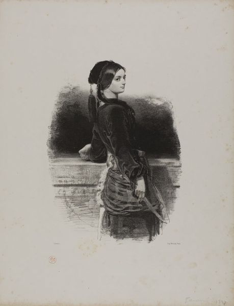 Editor: This is Paul Gavarni's "Gulnare: The Persian Slave". It's a striking lithograph. The woman's direct gaze makes me wonder, what does the image tell us about the exoticization of labor and its representation? Curator: It reveals much about the 19th-century appetite for Orientalism and its commodification. Consider the means of production: lithography, a method of mass production, is used to disseminate this image of a "slave." Editor: So, the print itself becomes a commodity, furthering the cycle? Curator: Precisely. The image's availability and consumption reinforce Western fantasies and power dynamics. The knife in her hand, part of the composition, feeds into it. Editor: I hadn't considered how the printing process itself plays into the narrative. Thanks for pointing that out!