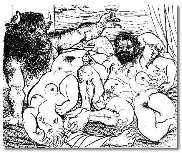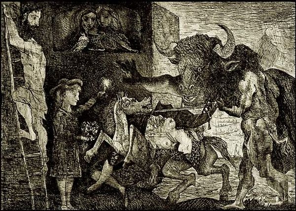 Curator: This is Pablo Picasso's ink drawing, "Blind Minotaur is Guided by a Girl," created in 1934. It's quite striking, wouldn't you agree? Editor: Immediately, I see the contrast between the coarse rendering of the minotaur and the delicate guidance. The composition is quite fragmented, a signature element of cubism. It projects a real sense of precariousness. Curator: Indeed. The use of simple ink lines on paper enhances that rawness. But it also elevates the symbol of the Minotaur beyond simple horror. Look how the girl serves as his moral compass, literally leading him forward. Do you think there's a visual connection between this guidance and, say, ideas around enlightenment? Editor: Undeniably. Blindness as ignorance, light as knowledge – classical iconography. She's almost Persephone leading him out of darkness. The girl’s upright stance underscores that. Curator: Notice too how Picasso plays with figure and ground. The dense, almost chaotic lines that create the minotaur stand in stark contrast to the relative clarity of the girl. Do you think the texture impacts the sense of vulnerability? Editor: It deepens it. The girl embodies compassion. I am struck by the enduring power of classical myths, but reimagined through Picasso's distinct symbolic language, a human beast being led through existential darkness. Curator: Absolutely. It makes us ponder not just the monster within, but the light that can guide us. Editor: It shows how certain archetypes of redemption continue to resonate within our visual culture. Food for thought, isn't it?