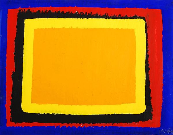 Josef Albers created "Variant/Adobe: Familiar Front" using oil on paper. The artwork presents a series of nested, rectangular forms in muted shades of yellow, pink and purple. The color combination gives the artwork a textural and spatial depth, suggesting a subtle interplay of light and shadow that is characteristic of Albers' work. The piece embodies Albers' exploration into color theory and perceptual psychology. By arranging these carefully chosen hues, he investigates how colors interact with each other, influencing our perception of depth and space. This work acts as a semiotic system, where color relationships serve as signs that engage our visual senses. The composition of the artwork destabilizes any fixed interpretation, inviting viewers to consider the dynamic, ever-changing nature of visual experience. It is through this careful arrangement of color that Albers challenges us to see beyond the surface, to engage with the deeper structures that inform our understanding.