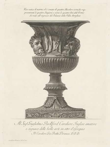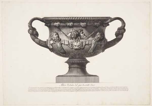 This print of a marble vase was made by Giovanni Battista Piranesi, sometime in the 18th century. Piranesi was a key figure in the Roman art world, and this print gives us an insight into the aesthetics of the era. The image displays a vase that seems to draw on the classical forms of the ancient world. The vase is covered in ornamentation, from flowers to birds, alluding to the natural world, a key feature of much classical art. In eighteenth century Europe, classical art became a symbol of power and authority, and Piranesi was canny enough to understand this trend. Prints like this one were collected by wealthy individuals and institutions, helping to shape taste and influence artistic production. To fully understand this print, we must consider the economic and cultural conditions that shaped its creation, and the institutions that have preserved it over time. By consulting historical archives and collections, we can learn more about the social and political context in which this image was made and consumed.