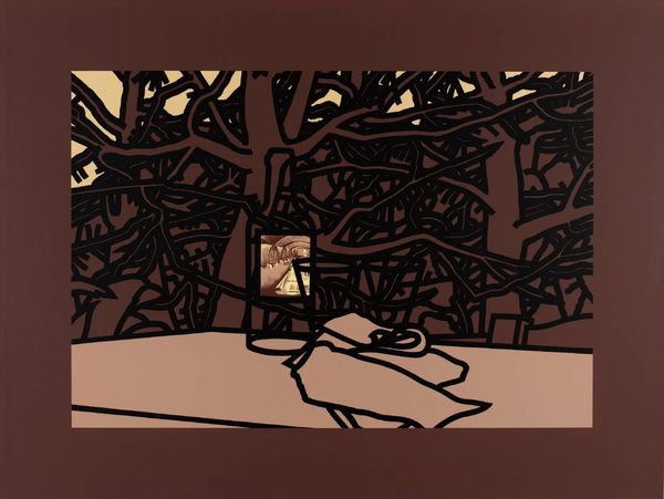 Curator: Patrick Caulfield's bold print, "Evening Menu," electrifies the space with its striking red palette. What leaps out at you? Editor: The starkness. It's like someone distilled a memory of a restaurant into its most basic, graphic essence. It feels both inviting and… slightly unsettling. Curator: Caulfield often played with the idea of high and low art, and the imagery here—still life, restaurant—speaks to that. It's so graphic, a commentary on commercialism perhaps? Editor: Definitely. The high contrast screams "advertisement," but for what, exactly? Ambience? The suggestion of pleasure? It’s a clever seduction. Curator: And that flat application of color, the almost aggressive simplification. Caulfield really challenges our perceptions, doesn't he? Editor: He does. It’s this tension between the mundane and the monumental that makes it so compelling. You could almost taste the wine, or is that just me?