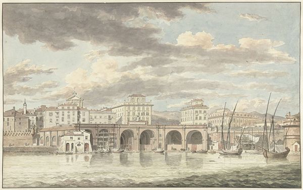 Jean Grandjean created this watercolor of the harbor of Civitavecchia in the late 18th century. The technique itself is important, using water-based pigments to capture a serene view of labor and trade. Watercolors have a particular relationship to immediacy. Unlike oil paints, which allow for layers and corrections, watercolors require a more direct approach. The artist delicately applies thin washes of color, building up tones and textures with careful control. This sense of immediacy lends itself well to the subject of the painting. It's not about the meticulous depiction of individual details, but rather about capturing a broader scene: the rhythm of the working harbor and its architecture. The use of watercolor in "De haven van Civitavecchia" reminds us that materials and processes are never neutral. They actively shape our perception and understanding, connecting the artwork to a network of cultural values.