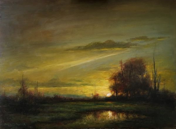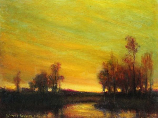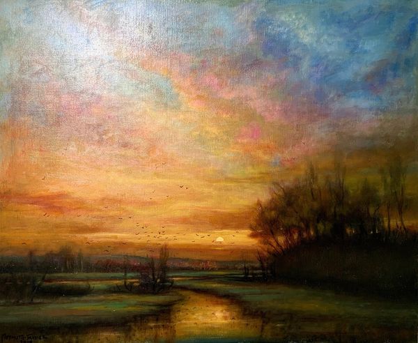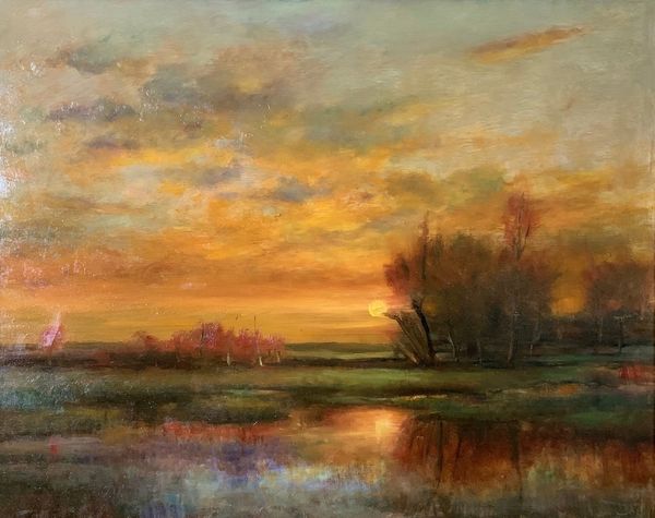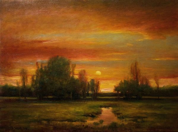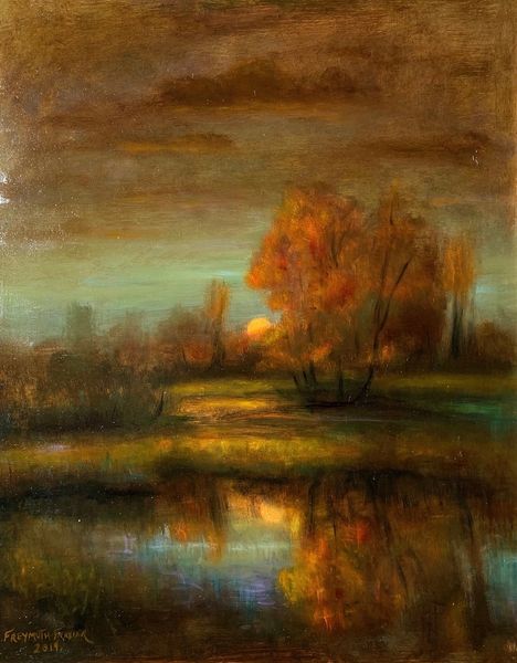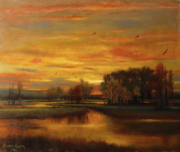 Editor: This painting, called "Night Birds" by Rose Freymuth-Frazier, was painted in 2016 using oil paints. It's captivating! The golden and deep red colors give it such a somber, yet romantic, feel. What do you see in this piece? Curator: Primarily, I observe the careful distribution of light and shadow. Notice how the artist utilizes a chiaroscuro effect, pushing the landmass into the foreground with deep shadows while the setting sun acts as a focal point, drawing the eye into the pictorial space. The sky, with its graduated tonality, reinforces a sense of depth, no? Editor: Definitely! The light reflecting off the water creates this wonderful mirroring effect, enhancing that depth even further. Curator: Precisely. And consider the impasto technique used to render the foliage. The application of thick paint gives a tactile quality, contrasting with the smoother treatment of the sky. This contrast in texture animates the composition. Does the use of these artistic decisions change your interpretation? Editor: It does. I appreciate the formal techniques and see how they emphasize specific elements and draw the eye through the work. Curator: Ultimately, the painting operates through its internal relationships of form, color, and texture. Editor: I see what you mean. Focusing on those relationships opens up new ways to engage with a piece!