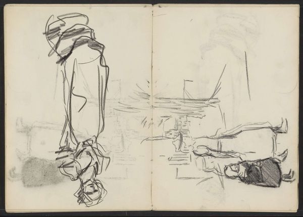 Editor: This sketch is called "Paard en een man," or "Horse and a Man" by George Hendrik Breitner, created around 1896 or 1897. It's a pen and pencil drawing on paper currently at the Rijksmuseum. It looks like it was sketched directly into a notebook. What strikes me is how fragmented it feels; more like details or snapshots than a cohesive scene. What do you see in this piece? Curator: The fragmentation is key. Breitner, a key figure in Dutch Impressionism, was fascinated by the fleeting nature of modern urban life. He sought to capture its essence, its raw, unpolished reality. Drawings like this served as studies. Think of them almost as photographic snapshots. He was using photography himself, and these studies provided source material. Editor: So, it's not meant to be a polished depiction, but more of an impression? How did this tie into the artistic trends of the time? Curator: Exactly. This piece rejects the idealized and formally posed art of earlier periods. In Breitner's time, art was becoming more democratized. It was about the everyday experiences of ordinary people and about art reflecting modern urban conditions. The subject matter, a man and a horse, isn't particularly grand. Editor: Right, it feels very ordinary. A working man, a working horse… Did that make Breitner popular? Curator: While appreciated for his directness, Breitner's gritty depictions of Amsterdam weren't always embraced. Some critics found his work too unrefined, lacking the aesthetic refinement they were used to. However, he's an important example of how art was expanding in subject, media, and public purpose, influenced by both technology and a shift in political engagement and public discourse. Editor: That's fascinating! It's so interesting how something that feels unfinished can be so deliberately capturing a specific cultural moment. Thanks for sharing your insight! Curator: Indeed, looking closely at Breitner forces us to reconsider how we understand "finish" and its role in defining not just aesthetics but in determining how we relate to art and to everyday life.