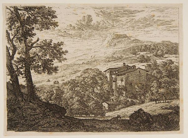 Curator: This is Allart van Everdingen's print, "Two Carts." The piece resides here at the Harvard Art Museums. Editor: It has a rather bleak tone, doesn't it? A stark contrast between the monumental landscape and the small figures toiling below. Curator: Observe how Everdingen uses line to delineate form and texture. The cross-hatching in the sky creates depth, while the delicate lines capture the foliage. Editor: And what of these figures? Consider their labor. It suggests a system where human effort is dwarfed by nature's scale and the demands of survival. Who benefits from this labor? Curator: Functionally, they create balance in the composition, leading the eye deeper into the scene. The stark contrast is striking. Editor: Precisely, and that contrast highlights societal imbalances, the uneven distribution of resources and power inherent within the landscape itself. Curator: A fitting reminder that art can be appreciated on multiple levels. Editor: Indeed, from form to socio-political context, a work offers a wealth of insight.