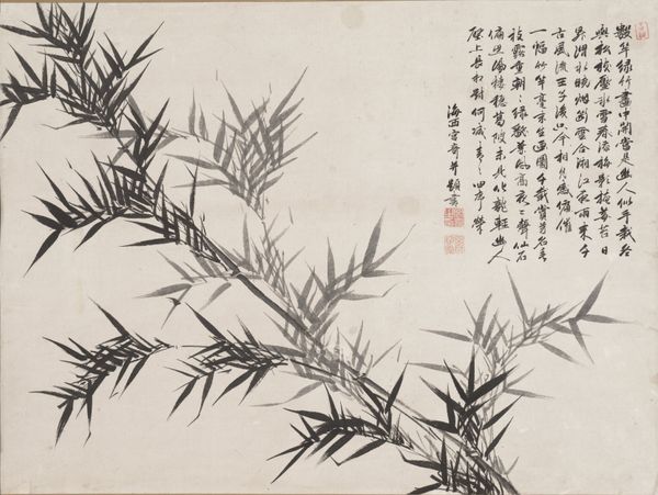 Curator: Shrimp, from 1864, rendered with ink on a hanging scroll. It’s by Kinoshita Itsuun, and is here at the Minneapolis Institute of Art. My initial impression is… stillness. It's surprisingly tranquil, isn't it? Even with creatures that are constantly flitting about in nature. Editor: Yes, there’s a minimalist elegance. The space around the shrimp almost vibrates. I see how the scroll format contributes, too, lending the work a vertical, even stately quality. For me the cultural connotations resonate deeply: shrimp in Asian art are a very common symbol of good fortune, abundance, and longevity because of their bent backs. The more ancient you are the more your spine curves and that has translated into their form symbolizing wisdom, and that comes from time and fortune and experience. It's this beautifully compressed visual metaphor. Curator: Ah, so each brushstroke is laden with symbolic meaning. Do you feel like this specific composition tells a particular story, then? Or offers a unique take on a traditional image? I think it looks to me more like a study of capturing the play of light. I see so many layers on this shrimp that appear only to capture different refractions of light as it might hit water. It makes it very temporal, like the artist could not capture that specific instance again even if they wanted to. Editor: Well, I am less familiar with capturing of the play of light and how one sees that in particular artists' works. It strikes me, also, the presence of calligraphic text and signature as integral to the overall image, rather than separate or secondary. Text as a kind of… abstract symbolic landscape in itself. The shrimp in their natural habitat of vegetation seems symbolic of humans in the greater context of nature itself. They cohabitate without friction, or the implication of disruption that could easily exist. Curator: You're making me rethink my quick first impression, I have to admit! Especially what you point out about the balance of nature here. These figures rendered in what seems to be so little effort but clearly is incredibly thought out - they take on new life when considering these interpretations. It adds layers. Editor: Exactly! Every detail pulses with significance, drawing from centuries of cultural memory and artistic evolution. In some sense it does not surprise that they coexist since they also act as food for one another, which can come across as a very basic and practical sentiment to consider about artwork that goes beyond this topic, yet the imagery, for me, always comes back to basic tenants. Curator: All of it makes for a very concentrated visual and symbolic language, doesn't it? The longer you sit with it, the more it unfolds, even from just a few brushstrokes. Editor: Agreed. It is one of the delights of studying imagery: unlocking how cultures reflect themselves through signs.