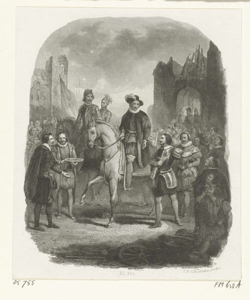 Curator: This engraving from 1841 depicts Willem III being inaugurated as Lord of Friesland in 1328. It’s housed here at the Rijksmuseum. Editor: It has a striking formality. The almost severe, clean lines emphasize a monumental quality despite the relatively small scale. Curator: Yes, the composition places Willem high above the crowd, emphasizing his authority and legitimizing his rule within a visual culture that supported monarchy. Prints like these played a critical role in shaping public opinion. Editor: Observe the meticulous rendering of textures, from the regal velvet cloak and shiny armor to the soldiers’ uniforms and horse tack, not to mention the stark castle silhouette, that altogether heightens the image’s sense of realistic granduer. It draws us to examine these elements to reconstruct meaning. Curator: It certainly romanticizes the past, tapping into a longing for a perceived golden age of Dutch power, quite common during the 19th century's rise of nationalism. Consider how the architecture acts as an eternal, unwavering witness. Editor: While I understand its historical role in nationalist narratives, I find the work formally fascinating in how it manages the relationship between individual and group, particularly when attention shifts toward linear detail defining form. Curator: The artist presents an interpretation that blends history with contemporary political needs. The print's purpose wasn't just to record an event, but also to mold perceptions. It embodies how institutions use art to advance ideologies. Editor: An important observation. Still, I am consistently pulled back to how the engraving translates visual complexity into contrasting shades of gray. It creates this balanced visual experience and guides the observer’s eye seamlessly, a noteworthy visual accomplishment in itself. Curator: Precisely, understanding the artistic license helps reveal how history is presented to and perceived by the public, further shaping civic awareness and sentiment. Editor: I see what you are hinting at, very insightful. On my end, recognizing visual order amidst apparent complexity really allows a broader appreciation of visual design.