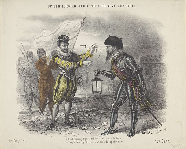 Curator: Allow me to introduce "Graaf Alva zoekt zijn bril," or "Count Alva Seeks His Spectacles," a print created by Jan Bos Wz., dating somewhere between 1842 and 1897. It resides here at the Rijksmuseum. Editor: Immediately striking. There's a farcical tone here. The texture created through the engraving is quite dense, lending the scene a chaotic energy, despite its static nature. Curator: Yes, it's a piece steeped in the historical and political context of its time. This is caricature, of course, using the visual language of history painting and genre-painting to comment on power, Dutch identity and Spanish occupation. The text above states Alva lost his spectacles on the 1st of April - an obvious nod to the ‘April fools’ tradition. Editor: Look at the detail in Alva's armor compared to the almost cartoonish representation of the figures offering the spectacles. The material production speaks volumes – the deliberate act of using engraving, a reproducible medium, made this satire accessible, and I wager the print's wide circulation probably played a role in shaping public perception. The use of 'Op den eersten April' points directly to that as well, with its playful relation to commerce due to the indicated price to purchase on the lower right of the piece. Curator: Precisely! And consider Alva, a figure of intense controversy in Dutch history due to his brutal repression, being portrayed here as a buffoon searching for his spectacles. It's about flipping the script, subverting authority. The print is poking fun at an oppressor by emphasizing their failings. It invites discussion on how collective identity can be forged by framing moments and events of national anxiety and celebration in relation to global happenings. Editor: And those spectacles floating between the two parties seem almost unreal! But speaking of its making and construction...there's this really tangible quality because you see the mark of the engraver so explicitly and the deliberate usage of this form of artistic printing helps bring out a form of collective labor, and a specific form of media and the politics of print, that would resonate widely throughout this society. Curator: Agreed, and beyond that I also consider what the role of "vision" played in crafting national ideologies. It offers an important contribution on analyzing intersectional narratives. The construction of national and cultural consciousness is really at the forefront of what Bos is pursuing. Editor: For me, examining those details through the lens of material practice enriches its understanding – bringing history to the surface! Curator: Yes, and helps highlight the historical nuances in its production as an entry point for critical dialogue.