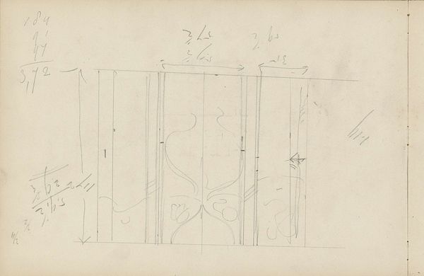 Curator: This is "Ontwerp voor een buffetkast," a buffet design by Carel Adolph Lion Cachet, dating back to 1908. What strikes you about this preliminary sketch? Editor: Immediately, I notice the faint pencil on what seems to be aged paper. It lends the drawing an ephemeral quality, like a memory barely captured before fading away. Curator: Absolutely, it’s the kind of thing you might find tucked away in a personal sketchbook. Cachet, deeply involved in the Arts and Crafts movement and influenced by Art Nouveau, worked with interiors quite often, beyond graphic design. Editor: Right. We're talking about craftsmanship elevating the everyday—the buffet as an aspirational piece of furniture. I'm curious about his choices regarding functionality versus decoration, if we compare this design with the real buffet, are the dishes stored actually reachable, is the counter really usable or just a show off? Curator: Functionality and decoration merge quite seamlessly here, I think. Notice the geometric precision intertwined with the slightly organic shapes topping the buffet. Those hand-drawn details give it a distinct personality, a break from total industrial production which makes it a more interesting artwork in the context of that time period. What do you feel when you think of the Art Nouveau? Editor: The balance... Art Nouveau always feels like a balancing act. And in terms of labor, look at all the handwritten lettering and measurements alongside the meticulous sketch work. We're getting a glimpse into the unseen hours of production, from design to material sourcing, all feeding into the making of a singular object. Curator: It’s truly amazing to see all those decisions frozen on paper, isn’t it? I’d love to tumble back in time and rummage freely through his sketchbooks to steal some ideas for my living room. What about you? Editor: Agreed. This reminds us that design is a constant negotiation between intent and execution, a blueprint hinting at larger social forces in production and consumption of art at that period in history.