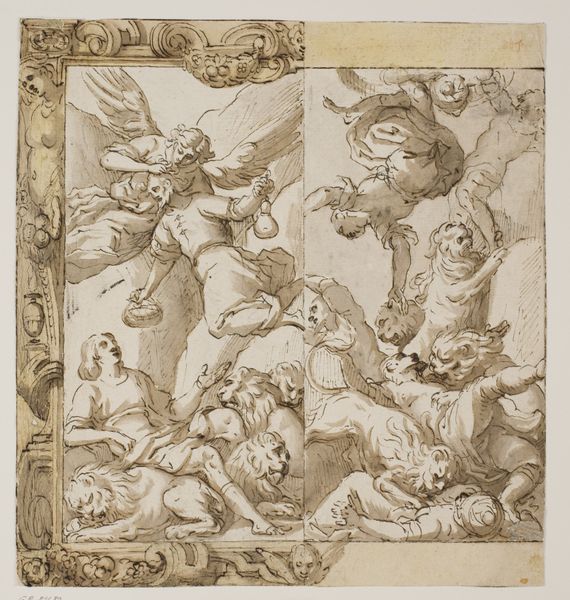Curator: What an evocative design! I sense swirling movement and almost palpable drama even in this toned ink drawing. Editor: This is "Ontwerp voor een plafond met vijf allegorische figuren," a design for a ceiling by Augustinus Terwesten, likely created sometime between 1659 and 1711. It's currently held in the Rijksmuseum. The artist used ink, tempera, and watercolor on paper to depict these allegorical figures. Curator: Allegorical… the piece definitely pulls you into that visual rhetoric of its time. Each figure feels symbolic, laden with potential meaning about power, virtue, perhaps even earthly concerns versus the divine. Editor: Right, allegory was a powerful visual tool in this period. Ceiling paintings were not merely decorative, but often served as propaganda, reinforcing the patron’s values and social standing. Curator: I immediately focus on the female figures – particularly the central one with her arms raised. There is a defiant sense to her pose. What sort of statement do you think it projects? Editor: It is interesting to read her that way. Consider the art world at this time: who commissioned this piece? How might their views impact her visual representation? A deep dive into the history of ceiling paintings is crucial. Curator: Precisely! Knowing more about Terwesten's specific artistic influences might give some clues, along with other imagery that he would use in other works for other social elites in that area, in order to understand better his own artistic views, regardless of gender. It is this kind of dialogue which reveals that these historical art pieces transcend and reflect issues concerning modern societies. Editor: Well, I agree up to a point, I think that such pieces reflected primarily the world of that time, the baroque aristocratic world in Northern Europe which saw this type of art form as symbols of power. Curator: A compelling artwork like this design prompts us to think beyond mere aesthetics, urging a profound meditation on history, identity, and meaning in representation across the eras. Editor: And on art itself! By examining this preliminary study in relation to Terwesten’s life and times, and by considering its function as ceiling decoration, we gain access into a network of artistic, social, and political relationships in Baroque era.