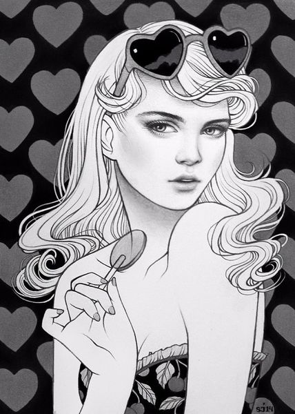 Sarah Joncas created this monochromatic portrait, "First Frost," using graphite and ink on paper. Its immediate visual impact arises from the stark contrast between the figure and the night sky. The artist evokes a sense of stillness and introspection through the careful gradation of tones and the symmetrical composition. The central figure, adorned with a floral crown, dominates the pictorial space, with the composition emphasizing symmetry and balance. The flowers, rendered with delicate linework, contrast with the solid darkness of the background. The falling petals introduce a sense of movement and ephemerality, destabilizing the static composition. This juxtaposition between the detailed rendering of the figure and the abstract background invites a semiotic reading, where the figure may signify beauty, and the falling petals a fleeting moment. The composition, carefully balanced yet suggestive of a world in flux, challenges fixed meanings. In this artwork, Joncas uses formal elements to engage with broader artistic and philosophical concerns about beauty, transience, and the complex interplay between figure and ground.
