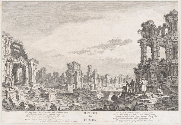 Editor: Here we have Étienne Dupérac's "Palatijn te Rome" from 1575, created using ink and engraving on paper. The sheer detail in this print is incredible. The ruined columns and architecture give a sense of both grandeur and decay. What strikes you most about its visual structure? Curator: Indeed. The composition leverages a compelling interplay between the ordered geometry of classical architecture and the encroaching organic forms of nature. Note how the verticality of the columns, though fragmented, imposes a structured foreground. Consider then, the meticulous arrangement of light and shadow, meticulously rendered through the hatching and cross-hatching of the engraving technique. Editor: It's almost a contrast between precision and chaos. The clean lines of the remaining architecture are juxtaposed with the decaying ruins being overtaken by foliage. Is this a conscious theme, do you think? Curator: Precisely! The geometric forms of the buildings offer a sharp contrast to the amorphous shapes of the landscape. One may read the ruins as visual representations of entropy. However, I encourage you to contemplate the stability implied by what remains; how form itself suggests an immutable essence. Do you perceive a clear focal point, structurally speaking? Editor: I think the central columns are a strong focal point due to their size and position. This guides the eye. Looking closely at Dupérac's skillful use of lines does add depth and structure to the scene. I appreciate noticing how the forms interrelate. Curator: Indeed. The careful arrangements contribute to the artwork’s semiotic complexity, inviting reflection on its structured beauty. Editor: Thank you for your perspectives. I have a greater insight into the form within.