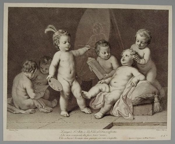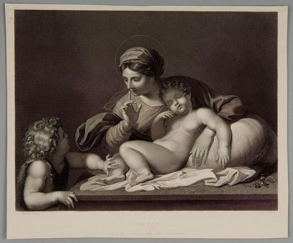 Editor: This is William Sharp's "Infant Christ". It reminds me of Renaissance paintings, so peaceful and serene. What symbols or hidden meanings might be present? Curator: Notice how the infant Christ sleeps, surrounded by angels? Consider the cultural memory. Sleep, here, isn't just rest. It prefigures death, sacrifice. Editor: Sacrifice? How does that connect to the softness of the image? Curator: Sharp uses the tenderness of the scene, the cherubic faces, to heighten the emotional impact of Christ’s future suffering. It's a potent visual paradox. Editor: I see it now, the foreshadowing within the gentle embrace. It's a lot to unpack. Curator: Indeed. Images often hold layers of meaning accumulated over centuries. Hopefully you’ll continue to dig deeper.