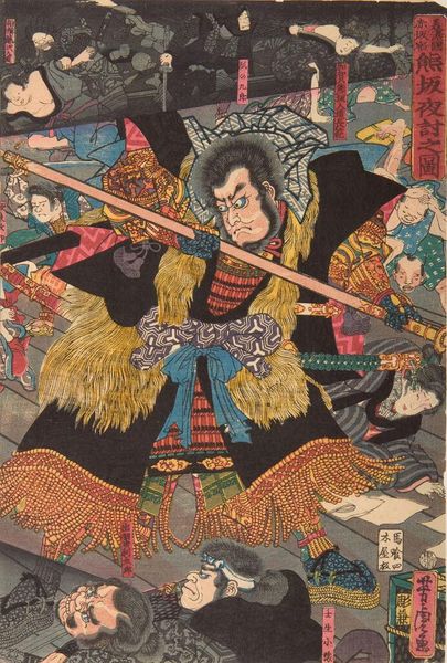 Tsukioka Yoshitoshi created this woodblock print showing Sakai Kyūzō hurling a spear. Note the blue and white makeup on Kyūzō’s face, as well as the blood trickling from his mouth. This iconography signals not just a warrior, but a figure deeply immersed in the throes of battle, embodying a kind of raw, untamed energy. Consider the motif of blood itself. It is a universal symbol of life, but here, mixed with the blue makeup, suggests a blurring of the lines between the human and the supernatural. This recalls the ancient rituals of sacrifice and transformation, where blood acts as a conduit between worlds. We might also consider the tattoos adorning Kyūzō’s arms, symbols of identity and belonging that speak to a deeply ingrained sense of honor and duty. These tattoos, like the blood and makeup, transcend mere decoration, serving as powerful emblems of cultural memory and psychological identity. Ultimately, this print serves as a potent reminder of the cyclical nature of human experience. It shows us that symbols persist, evolve, and re-emerge, carrying with them echoes of the past and shaping our understanding of the present.