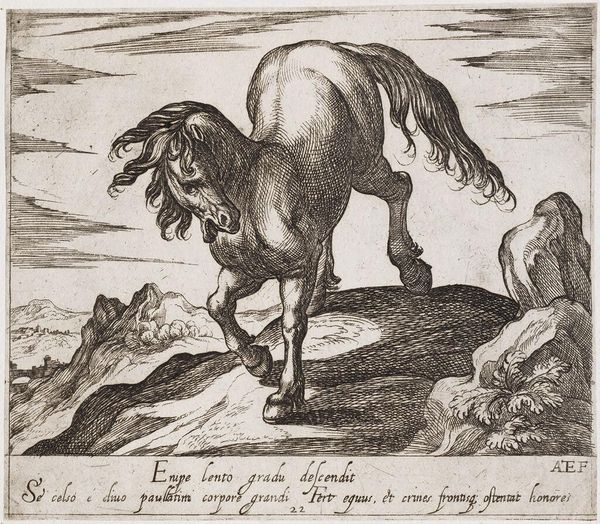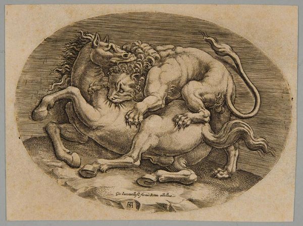 Editor: This is Antonio Tempesta's "A Horse Kicking a Lion." It's striking how much energy is packed into such a small, monochrome image! What does it say to you? Curator: This image carries potent symbolism. The horse, often associated with nobility and power, is here triumphing over the lion, a traditional symbol of royalty and courage. Do you see the implications of this reversal? Editor: So, it's not just a fight, but a statement about overturning power? Curator: Precisely! Tempesta is playing with established iconography, perhaps reflecting societal shifts or challenging the viewer's assumptions about inherent power structures. The image resonates with enduring themes of dominance and rebellion. Editor: I hadn't considered the deeper symbolic meaning beyond the surface-level conflict. That's really fascinating! Curator: Indeed, symbols are powerful precisely because they condense complex ideas into a single image.