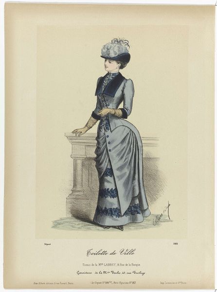 Curator: I find myself really drawn to this fashion study—"Japon 'Don Quichotte' van Doeuillet, 1910, No. 106"—created around 1910. It's watercolor and drawing. My initial thought? Melancholy and delicate beauty, like a fading flower preserved in ink. Editor: Ah, yes, a period of high romanticism filtered through the emerging influences of Japanese aesthetics—Japonisme. The dress itself, a study in draped fabric and the oversized hat, they speak to a yearning for something perhaps unattainable, a chivalrous dream, if we think of Don Quixote. Curator: Exactly! I love how it hints at that turn-of-the-century angst, the sense of change lurking beneath the surface of refined society. But there’s also this strange assertiveness in her gaze… as if she's quietly determined to tilt at her own windmills. Editor: The colour choices contribute to this quiet drama; the somber blacks and grays of the dress create a weighty elegance, playing with themes of shadow and substance. And notice the addition in pencil, there is also a drawing of a very elaborate detail near the bust, it all adds to the idea of status and desire. The oversized hat adds further visual symbolism in her desire to stand apart and express herself through status, despite its restrictions on women at the time. Curator: Yes, and her pose seems a bit theatrical, don't you think? Like she is aware of being observed but is keeping everyone guessing on the meaning of her pose. There's an almost defiant poetry there. What does "Japon" add here to "Don Quichotte"? It must add something special! Editor: I think that "Japon" in the title here refers specifically to the use of asymmetry in composition. In Don Quichotte, a great deal is always a little 'off'. There's a sense of imbalance that keeps you looking! It feels both classically chic and modern, and perhaps a little absurd as a design to be practically manufactured. Curator: It’s like a whispered rebellion, a longing for something different from society’s confines. Maybe that's why this design resonates so much even now. It whispers, 'Dare to dream; dare to be different.’ Editor: Precisely, it captures that tension perfectly. It makes me want to examine what's changed in fashion—and what hasn’t—over the past century. Curator: Same! A lot of that desire to express something in life without even having to say a thing… Editor: Food for thought… and sartorial aspiration!