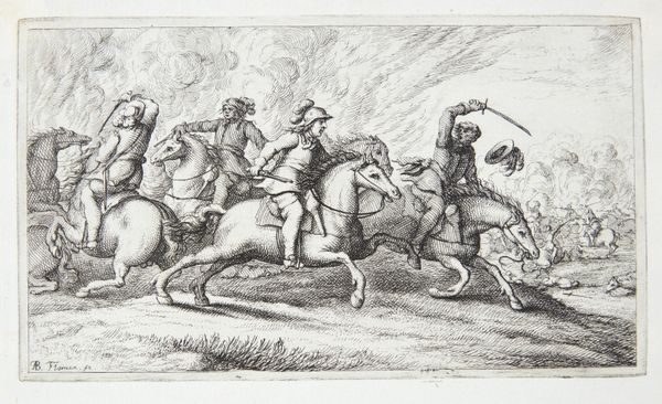 Editor: So, this is "Two Riders in Conversation" by Georg Philipp Rugendas, created sometime between 1676 and 1742. It's an engraving, and the details are amazing. It's stark but active, with these figures frozen in conversation but the rest of the background bustling. How do you interpret the symbolic imagery here? Curator: Notice the ruin looming in the background to the left, versus the implied progress or motion indicated on the right with the riders near the mountains. What does that visual dichotomy tell us about cultural anxieties of the time? Is it progress versus the weight of the past? Editor: That's interesting; it feels almost like a visual argument. So the riders in the foreground become actors *within* that argument, somehow? Curator: Precisely. Observe how the riders are staged centrally and in such detail, juxtaposed against a broader, less distinct, conflict. Think about the symbolism of horses, nobility, even travel itself within that period, and what anxieties or desires are represented here. Editor: Travel meaning encounters? Social hierarchies playing out in transit? Curator: Consider also that engraving is itself a method of replication and dissemination. Who were the intended viewers and what meanings were being carried and reproduced with each impression? What does it mean to communicate these riders? Editor: I never thought about the engraving itself as part of the message. Curator: Visual symbols are not stagnant. They reflect the artist's intent, the cultural context, and even our own modern perspectives. That is the potency of cultural memory. Editor: That gives me a lot to think about— how each element speaks, from the riders themselves to the medium, and how these visuals play out in history. Thanks!
