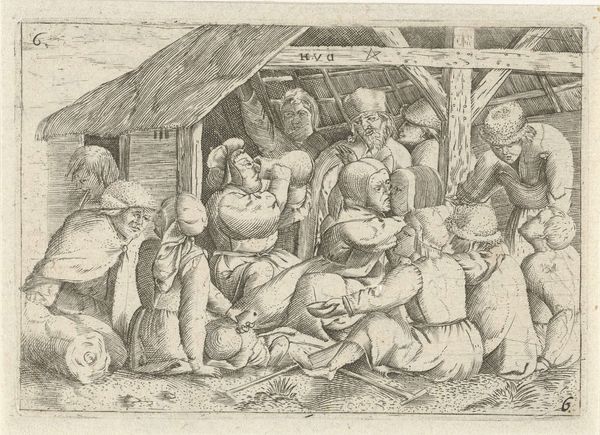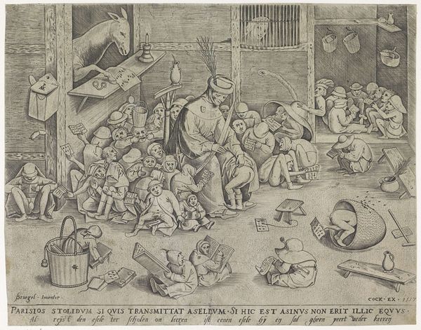 Curator: Let's discuss Pieter Bruegel the Elder's 1563 engraving, "The Fat Kitchen". What are your first thoughts? Editor: It’s bursting with abundance – almost overwhelming! The figures are so plump, crammed into this space with all manner of foodstuffs. It evokes a sense of chaotic feasting, but also something a bit darker... gluttony, perhaps? Curator: Gluttony is indeed one reading. Look at the sheer volume of foodstuffs, the array of sausages, game, and overflowing platters. Bruegel, through the engraving process, highlights the abundance of resources through careful application of line creating depth in a complex image, almost certainly commenting on Flemish materialism during that era. He certainly wasn't celebrating frugality! Editor: Right, there is that overflowing energy of production you mentioned. What stands out to me is the cultural symbolism in the figures themselves. Their exaggerated bodies point to specific ideas. The figure suckling the child suggests sustenance, while the men grappling at the door perhaps represents wasteful conflict. What are they fighting over, or against? What desires, what greeds? Curator: We must consider too the labor inherent in this image. All these sausages, all this prepared game, required production. This abundance does not manifest from nowhere. Are we meant to think about exploitation when viewing this supposed revelry? This is no landscape. It's a still-life bustling with activity. Editor: And I would push you here. Not only the material, physical labor but also consider the cultural 'work' the image does to evoke feelings, or instruct with symbolism. The abundance of pots, hanging from the ceiling as implements and icons of the kitchen; they aren't merely tools but symbols of food and warmth, essential to social life. I read into them, the safety net they promise or once did before greed entered the picture... Curator: Very astute. I think seeing the symbolism that the equipment held contextualizes the experience these figures felt during production, preparation and celebration. Thank you. Editor: Thanks. Examining this from a point of symbols as well as physical labour unveils powerful contradictions around that era.