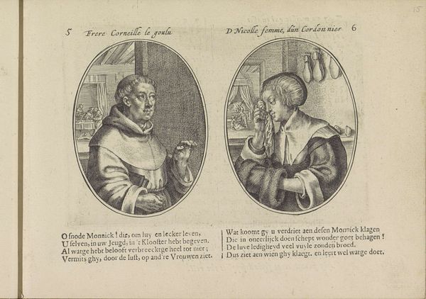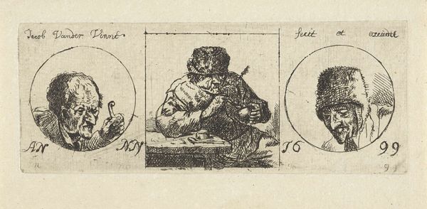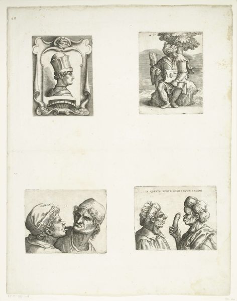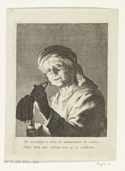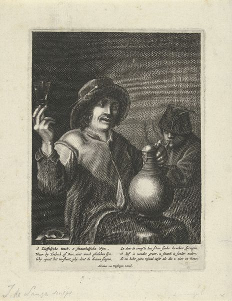 Curator: Before us is a piece entitled "Aarde en Lucht," which translates to "Earth and Air," dating from sometime between 1724 and 1751. It's an engraving. Editor: My immediate reaction is one of stark contrast. The sharp, precise lines delineate figures that seem almost caricatures of avarice and frivolity. It’s a fascinating juxtaposition of austerity and carefree abandon. Curator: Absolutely. Consider the socio-economic conditions that informed its production. Prints like these were relatively affordable, making them accessible to a burgeoning middle class hungry for moralizing tales and social commentary. Look closely at the figure representing "Earth." Editor: The detailing is exquisite. Her worn face and grasping hand highlight her attachment to worldly possessions, her singular attention and effort in guarding her treasure. Curator: This image uses visual vocabulary to illustrate societal attitudes. Printmaking was also often a collaborative undertaking; understanding workshop practices sheds light on standardization versus individual artistry within these periods. Editor: I'm more drawn to the formal arrangement. "Air," the boy, appears lighter, more spacious. See the way the engraver uses varied line weights to create depth? The contrast accentuates his youthfulness and apparent lack of concern. The frog, a strange juxtaposition for "air", does the animal represent what could be "taken" from his innocence. Curator: Interesting idea, although I find myself questioning what statements might have come up by using such animal, knowing the role of humans in domesticating fauna, and other material practices associated with it, such as clothing styles and the class differences they signal. Editor: Agreed, and still the interplay is captivating; these visual devices communicate on multiple levels. Curator: Considering print production and the burgeoning accessibility of art to the middle class also creates other avenues of research in which ideas, skills and knowledge are brought forth for society consumption. Editor: Truly thought-provoking work! Seeing this interplay of visual dynamics has shifted how I consider it and it's period, perhaps.