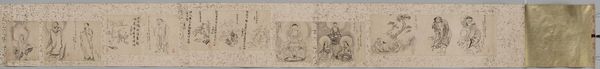 Curator: Let's consider this extraordinary scroll, "Sketches by Tan'yu," created by Kano Tan'yū in the 17th century. It's rendered in ink and light colors on paper, offering a glimpse into the artist's visual world. Editor: It feels like a visual diary, almost stream-of-consciousness. I'm getting a vibe of playful spontaneity, like the artist was just letting his mind wander and capturing it all with a brush. Curator: Precisely. Tan'yū was a master of the Kano school, known for its emphasis on line and brushwork. This scroll showcases his skill in capturing diverse subjects, from figures to landscapes. The materiality of the paper itself speaks to the context of artistic production at the time. Editor: The sheer length of it! Imagine unrolling that...it's like stepping into the artist's extended moment of creation. I wonder what stories are hidden in these fleeting images. Curator: Absolutely. These "sketches" are not mere preparatory studies, but independent artworks, revealing the artistic process itself. Editor: Yeah, I'm suddenly feeling connected to the hand that made this, the choices they made, the world they inhabited. It makes you think. Curator: Indeed, a tangible echo of a past vision. Editor: A vision that continues to speak, centuries later.