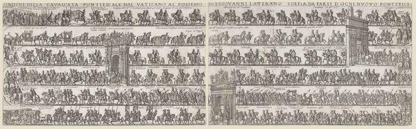 Curator: I’m struck by the precision of detail in this print. It's overwhelmingly linear. Editor: This engraving captures “Hertug Christian Albrechts indtog i Kiel”—or, in English, Duke Christian Albrecht's Entry into Kiel. Created sometime between 1665 and 1669, it commemorates a key historical event for the city, now located in Northern Germany. Curator: Entry into Kiel. Looking at it through the lens of power and privilege, the repetitive depiction of soldiers on horseback and carriages creates a dizzying display of dominance. It almost feels oppressive. I want to know what these entrants meant for those being entered. Editor: Absolutely, that perspective is critical. What’s remarkable to me is how this print not only chronicles history but also embeds cultural memory through visual language. The use of horses as symbols of power, for example, has a long history dating back millennia. You can see each regiment depicted distinctly, but notice the strategic use of hierarchical scale placing Albrecht above the people? Curator: It definitely serves as propaganda reinforcing social order through visual spectacle. The procession becomes a physical embodiment of authority. Is this celebration for all of Kiel, or just its elite? Editor: An interesting point, because these cityscapes often serve dual functions: documenting an event and legitimizing a ruler. Consider, too, that the cityscape in the background appears very rudimentary—suggesting that perhaps the artist aimed to portray Kiel as a backdrop for the ruler, and not the other way around. Curator: You’re right, there's almost a dehumanization within the march, all in service of maintaining hierarchy. As a representation, what is the cost to Kiel’s cultural identity in the piece? Editor: That’s what stays with me as well—what is deliberately included, what is subtly emphasized, and what ends up left out from such formal commemorative works? How do we then read those elisions, today?