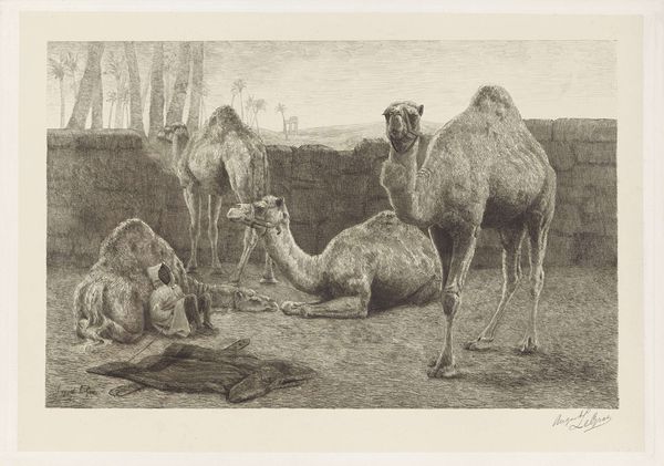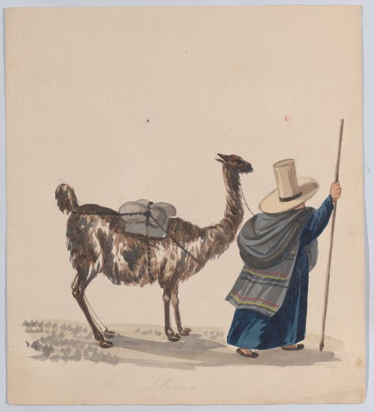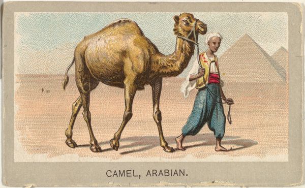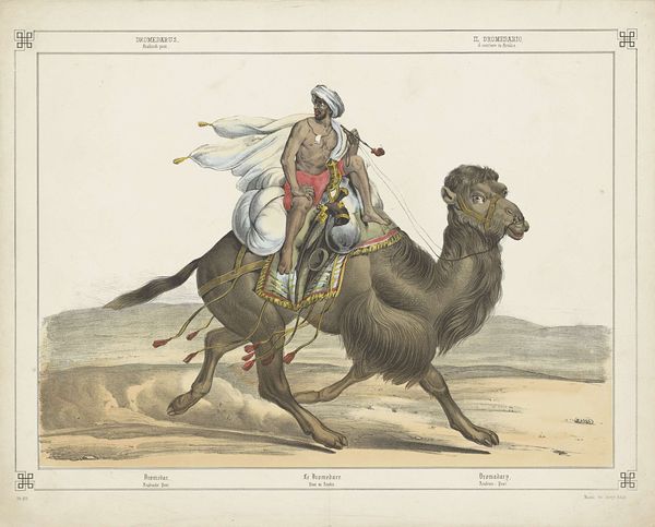 Editor: This watercolor painting, dating somewhere between 1829 and 1880, is entitled "Kamel./Chameau./Camel./Kameel./Cammello" and is attributed to Firma Joseph Scholz. What strikes me most is the almost scientific precision with which the camel is rendered, contrasted with the softer landscape in the background. How do you interpret this contrast? Curator: Ah, yes, the camel as specimen! It reminds me of those natural history illustrations intended to both educate and, let’s be honest, subtly reinforce a sense of European dominance over the natural world and other cultures. Notice the almost clinical detail given to the dromedary itself—every hair, every wrinkle lovingly rendered. But the scene… that’s where things get interesting. Doesn’t it feel almost like a stage set, that backdrop? As if the ‘real’ subject is the camel and the exotic landscape is just an accessory? Editor: That’s a great point! I hadn't considered the possibility of the landscape as an almost...theatrical backdrop. What's particularly interesting is the blend of scientific illustration and something leaning toward Orientalism. Curator: Precisely! It’s this tension, this push-and-pull between objective observation and subjective fantasy, that really animates the work for me. It makes you wonder: What did Scholz truly intend to capture? Was it the animal, the Orient, or something else entirely, something hiding beneath the surface of the watercolor? Perhaps, like so much art, it was about trying to grasp something just beyond reach. Editor: So, it becomes almost more about the European perspective and fascination than the subject itself. Food for thought, definitely! Thanks for sharing. Curator: My pleasure! Now I am thinking I might actually ride a camel one day!