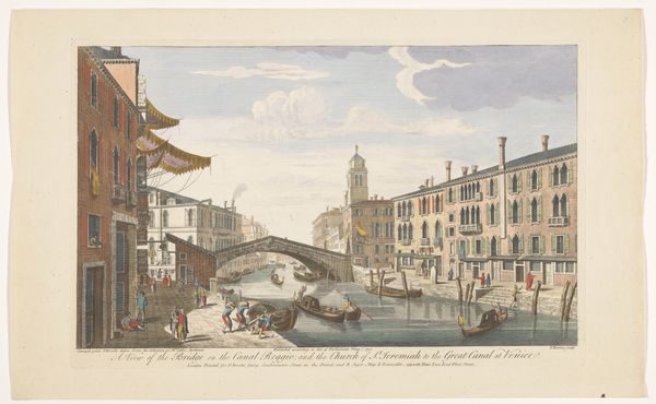 Curator: This is a print made by Antonio Sandi, active between 1743 and 1817, depicting the Rialto Bridge over the Grand Canal in Venice. The print, done with engraving on toned paper, gives us a snapshot of Venetian life centuries ago. Editor: It feels very precise, almost clinical in its detail. While detailed, I sense a slight detachment, a formality typical of Baroque sensibilities. Curator: I agree it's precise. It's helpful to consider that Venetian painting, and printmaking of this period, often served specific political and economic purposes. Think of Venice as a powerful mercantile city-state eager to showcase its wealth and power. Editor: You can see that in the symmetry and order of the composition. The bridge itself acts as a symbol, of course – connecting, facilitating commerce, displaying architectural prowess. But the sheer amount of traffic, the gondolas, the bustling people—it all speaks to Venice’s self-image as a thriving, vital center. What about the baroque artistic approach influences such social documentation? Curator: It’s all very calculated, right? Consider, though, that even in these seemingly objective cityscapes, the artist’s choices are laden with ideological weight. Who gets represented, how, and in what context? It reinforces a power structure, making Venice look unified. Editor: The very style seems to add to that, to cement those images. Even down to the 'old engraving style'. Those gondolas carry their significance through generations. The bridge remains, and its depiction stays true. Curator: Exactly. Sandi’s print wasn’t just documenting a view, it participated in a visual dialogue—affirming existing structures of power and belonging within a particular historical moment. We are not passive when it comes to observing it today; the observation, now, is a dialogue in itself. Editor: That gives me so much more to think about concerning how spaces in these types of pieces can echo far beyond a simple rendering of Venice, impacting the modern view of social space and community today. Thanks for bringing a rich approach. Curator: Thank you. These glimpses into Venice help reflect back on the ever evolving social landscapes around us.