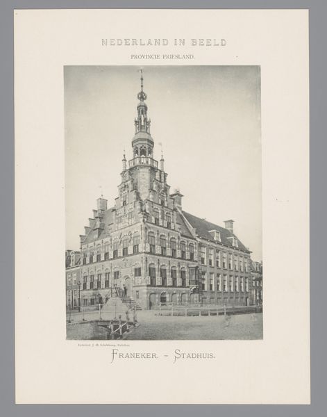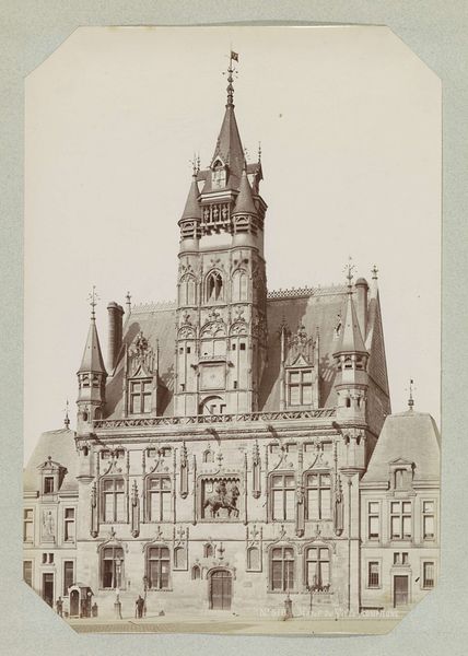 Editor: This photograph, taken by Joseph Maes between 1887 and 1908, captures the Hotel Communal de Schaarbeek in Belgium. It's an imposing architectural shot; what do you see in it, especially considering its historical context? Curator: What strikes me immediately is the assertion of civic pride through architectural grandeur. The late 19th century was a period of immense social and political transformation in Belgium, including significant expansion of local government responsibilities. How might a structure like this function not just as a seat of power, but as a symbol of stability during turbulent times? Editor: That's interesting! It makes me think about how city halls now are designed versus back then. Did the architecture serve a purpose other than symbolizing power? Curator: Absolutely. The neo-Gothic and Renaissance revival elements were a deliberate choice, intended to connect the present with a perceived glorious past, lending legitimacy to the new civic order. Also, consider photography’s evolving role in shaping public perceptions – were images like this aimed at documenting or promoting the municipality, or both? Editor: I hadn’t thought about the dual purpose! The city hall seems almost unreal, an idealized image for the community. What kind of reception did these pictures have at the time? Curator: Given increased literacy and access to illustrated publications, these photographs helped solidify a sense of local identity. They were consumed and displayed widely, contributing to both civic branding and a sense of belonging. Editor: So the photo is more than just a historical document, it’s actually part of the historical process itself, right? That gives me a whole new perspective! Curator: Precisely. Thinking of art this way really highlights the social role that photography played.