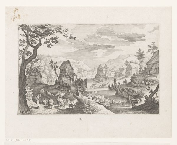 Richard Earlom created this coastal landscape with the arrival of Aeneas in Pallanteum in 1777. The sepia wash drawing presents a scene of classical arrival, composed with careful attention to tonal contrast and spatial arrangement. The composition is structured around the contrast between the dark, detailed foreground and the lighter, more atmospheric background. Note how Earlom uses densely packed lines and shading to define the forms of the trees, figures, and architecture on the left. The artist guides our eye with the ships and their rigging towards the distant shore, where lighter washes suggest depth and distance. This interplay of light and shadow isn't merely decorative; it reflects Earlom’s engagement with classical ideals of landscape. The calculated arrangement of elements invites contemplation on themes of journey, foundation, and civilization. The sepia medium contributes to the drawing's contemplative mood, positioning it within a tradition of idealized landscape art. Consider how the artist uses these formal elements not just to depict a scene, but to evoke a sense of historical and cultural significance.