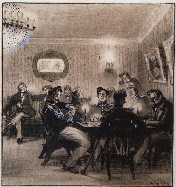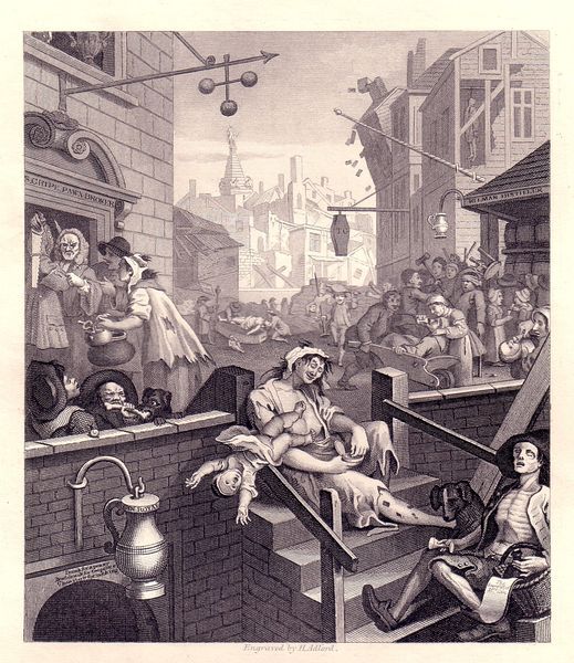 Curator: What strikes me immediately about Joseph Webster Golinkin's "Speako Deluxe" from around 1928, created using pencil and print, is its stark atmosphere, despite the implied conviviality. Editor: Indeed, the contrast is quite potent. The monochromatic palette and the precision of the linework lends an almost architectural quality, containing the revelry as if diagramming the performance of leisure. But consider: what is "deluxe" about it, and for whom? Curator: I see your point. The figures are stylized, elongated, almost flattened into the scene, a hallmark of Art Deco. It gives the impression of a meticulously staged tableau vivant, and that artifice underscores your questioning. Editor: Precisely. It’s the Roaring Twenties viewed through a scrim of anxiety. Prohibition, wealth inequality…the party is for some, enabled by others. This isn’t a candid snapshot but a curated performance of affluence in a period riddled with social tension. Curator: The composition draws your eye into the room via that winding bar. The artist uses a convergence of lines to pull you in, engaging you to observe these discrete figures in their various couplings and poses. The formal components contribute to the artwork's depth. Editor: And within that carefully constructed depth, note who occupies center stage—the serving staff and bartenders—the infrastructure upon which this excess depends. The elite mingle behind them in shadow. To view it merely as an illustration of Jazz Age exuberance is to miss the social commentary woven into its structure. Curator: The artist undeniably uses those perspectival lines to focus attention, the vanishing point serving as more than just compositional architecture, I'll grant you that. It makes for a dynamic piece, charged with that inherent tension. Editor: It's a fascinating study, not only of form but of the narratives that underpin the gilded age in art and society, so effectively realized in Golinkin's piece here. I think we would benefit from analyzing more of this period using intersectional and historical understanding to expand our views of American life and Modern art.