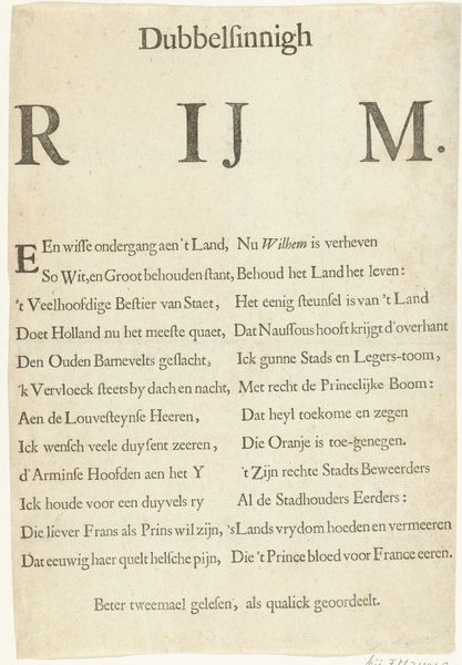 Curator: This striking typographical print is called "Tekstblad bij de prent van Frederik Hendrik die in een triomfwagen Den Haag binnen rijdt, 1629." It dates from around 1700-1721 and it's currently held at the Rijksmuseum. What impressions do you get from it? Editor: My first thought is—intense. It feels dense, almost claustrophobic, with all that tight, controlled text pressing in. The typeface, it's beautiful, but it demands attention, almost like a proclamation. Curator: Absolutely. This work is significant because it's a commentary penned by Joost van den Vondel, one of the Dutch Golden Age's most important writers. Vondel questions why advocate Oldenbarnevelt is placed above 's Hertogenbosch’s triumph in print. Consider the power dynamics at play during that time and what it meant to challenge authority in such a direct manner. Editor: Ah, Vondel! Of course, a master of biting critique served with poetic flair. So, it's not just decorative text; it’s a deliberate intervention, questioning the establishment. I love the immediacy of "gaf op staande voet dit antwoordt"—like he couldn’t wait to put his thoughts to paper. It brings to mind, almost, a rebellious streak from an earlier age. Curator: Exactly. Vondel consistently challenged norms. And given that this piece engages directly with a triumphant depiction of Frederik Hendrik, it inserts itself into discussions of power, religion, and justice—crucial elements in understanding the socio-political climate. The Contra-Remonstrant perspective adds yet another layer of interpretation to the history it captures. Editor: You're right, understanding who’s speaking—or writing—is key. Thinking of today, it’s a bit like a supercharged blog post reacting to some major political event, rendered in exquisite calligraphy! This blend of ephemeral commentary with durable artistry is something to savor. Curator: It does prompt us to rethink the nature of dissent and how historical perspectives intersect with current discourse. Appreciating works like this encourages us to ask pressing questions about art and accountability. Editor: Indeed. And for me, it’s a wonderful reminder that even the smallest printed word can hold universes of meaning and be a revolutionary act in disguise.