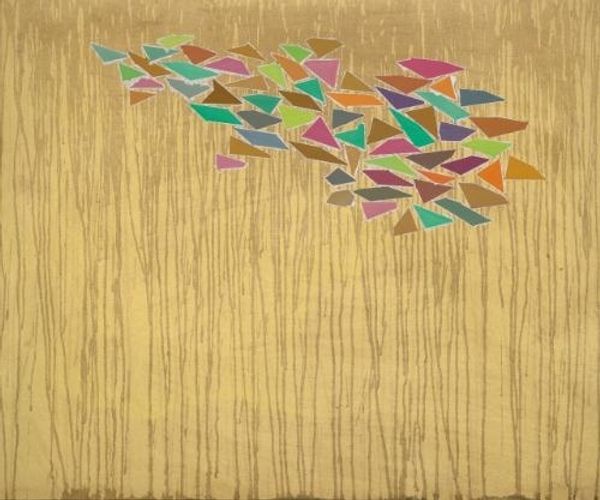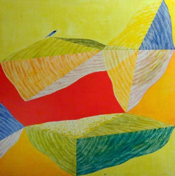 Jagdish Swaminathan painted "Bird, Tree and Mountain" sometime in the 20th century using what looks like oil on canvas, and the forms he paints emerge from a process that feels intuitive. The lines that form these triangular planes have a very tactile quality, giving the mountains a kind of soft, almost fuzzy texture, which is juxtaposed against the flatness of the yellow ground. There's this one spot, right at the top, where he's painted a tiny bird, perched precariously on the mountain's edge, this little mark suggests a real sense of scale, and almost feels like a symbol of hope or freedom. I'm reminded of Etel Adnan, the way she similarly reduced landscapes down to their bare essentials, using colour and form to evoke a sense of place and emotion. And just as with Adnan, this piece embraces a kind of beautiful ambiguity, inviting us to bring our own interpretations and experiences to it.