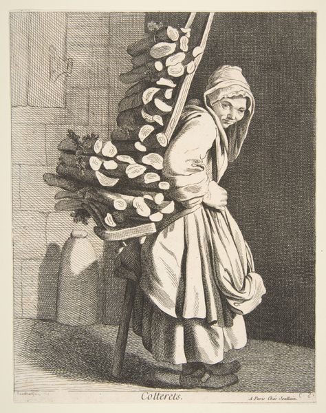 This print, "Flower Vendor," was created by Anne Claude Philippe Caylus, sometime in the 18th century. Caylus, an antiquarian, collector, and above all, an academician, was deeply invested in the hierarchy of genres that defined French art institutions at the time. Prints like this one played a crucial role in shaping public perception. It offers a glimpse into the lives of working-class women in Paris, navigating the economic and social realities of their time. The image is seemingly straightforward. However, we need to remember that the print was made during a period of profound social inequality, and it’s hard to ignore how the art world generally catered to the tastes of the wealthy. Caylus was very invested in the academy. So we might ask: is the image intended as a mere record of everyday life, or does it engage with the social issues of its time? To truly understand this print, we must look into the economic conditions, social structures, and artistic conventions of 18th-century France, using sources such as period documents, market reports, and theoretical writings.