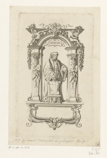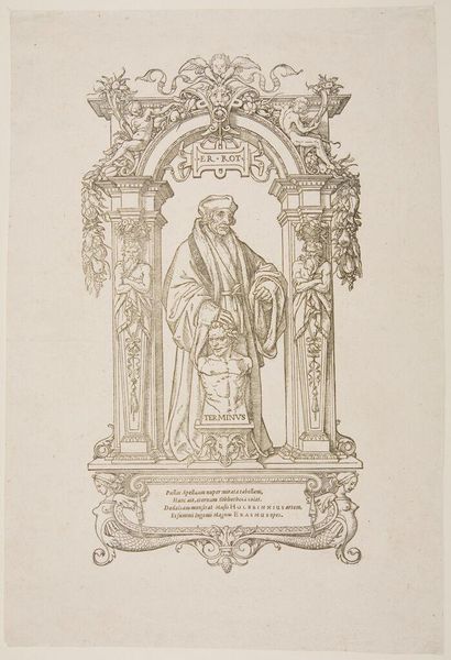 Jean Baptiste Amédée Guillaume created this detailed portrait of Desiderius Erasmus using etching and line engraving. The image is dominated by a symmetrical composition, framed by classical architectural elements and ornate decorations. This gives it a sense of formality, perhaps seeking to convey Erasmus's intellectual stature. The use of line, from fine hatching to bold outlines, creates a rich visual texture and depth despite the monochromatic palette. The positioning of Erasmus above a bust labeled "Terminus"– the Roman god of boundaries– suggests ideas about knowledge and its limits. Erasmus's gesture of placing his hand on the bust could be interpreted as a symbolic act of mastering or contemplating these boundaries. Guillaume masterfully employs techniques of engraving to generate tonal variation, thus enhancing the visual impact. The overall effect invites a semiotic reading of the image, where architectural motifs, inscriptions, and the figure of Erasmus become signs within a larger discourse on humanism and classical knowledge. This engraving serves not only as a portrait but as a complex symbol of Renaissance ideals.